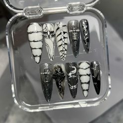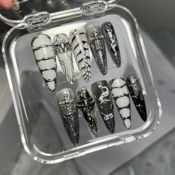 1 review for Black and White Bone-Inspired Press On Nails, Gothic Skeleton Nails for Halloween, 3D Halloween Nails with Cross and Skull, Dark Cross Nails